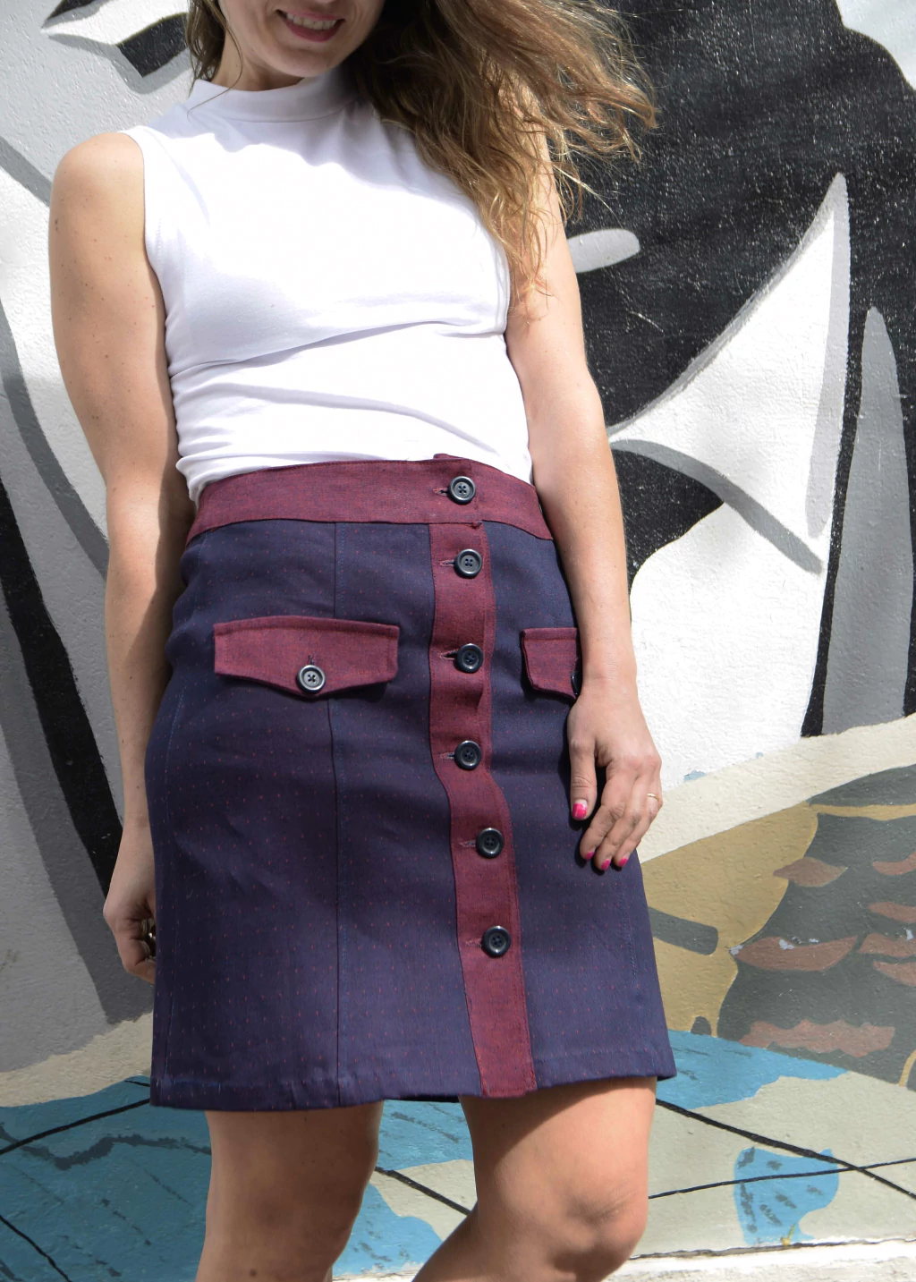 Falda con botones y bolsillos delanteros. Confeccionadas en simil jean elastizados. Increíble calce y largo ideal.