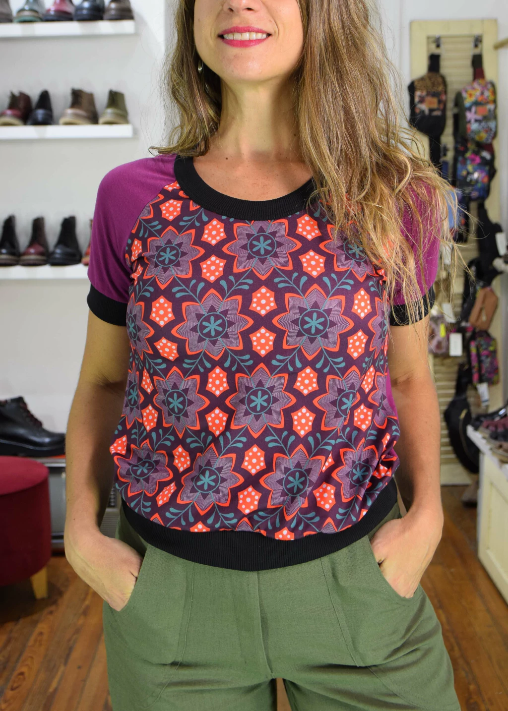 Tiene terminaciónes de ribb en cuello, cintura y mangas (pueden variar los colores)