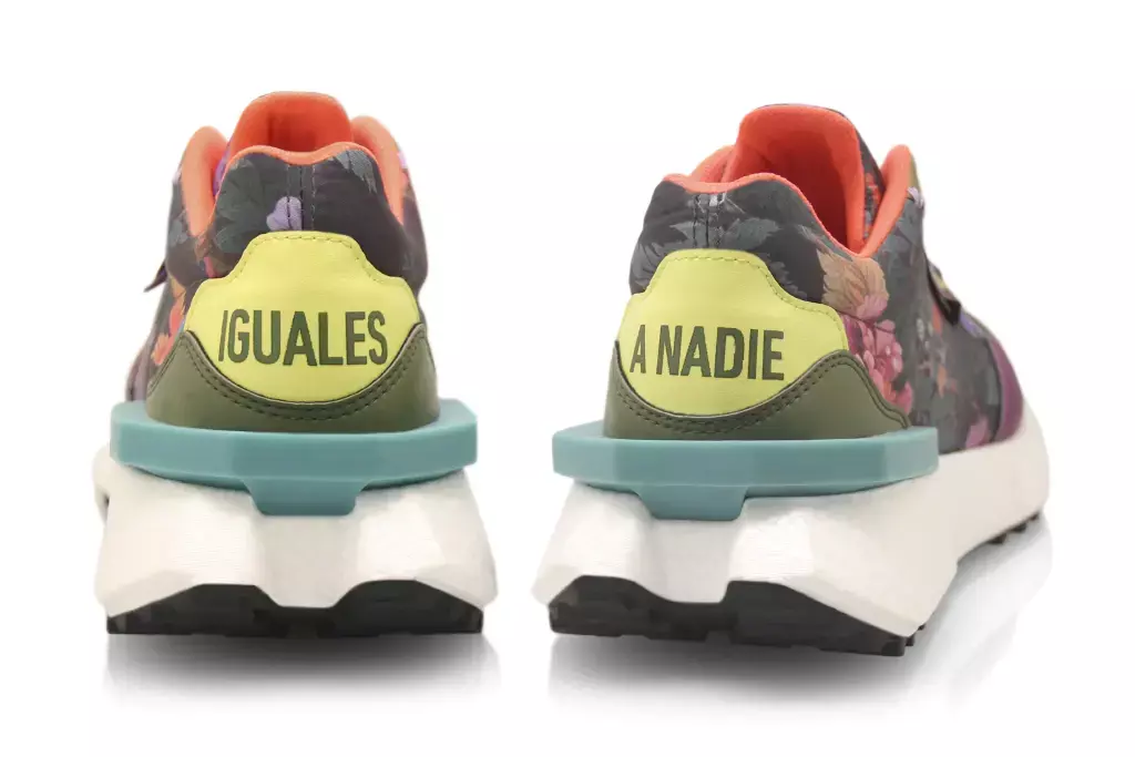 La capellada de tela microfibra reforzada y estampada aporta resistencia y un look original, mientras que la cordonera en bronce suma un toque distintivo. El talón en sintético verde oliva y lima fluo resalta con detalles de costura pespunte y zigzag, asegurando durabilidad y diseño.